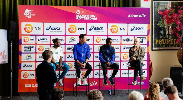 Gemaakt door Running NL. Internationale en nationale favorieten blikten vrijdag 10 april tijdens de persconferentie in Dudok aan de Maas vooruit op de 45e editie van de NN Marathon Rotterdam, die komende zondag 12 april plaatsvindt. Onder meer parcours- en Europees recordhouder Bashir Abdi liet weten in goede vorm te